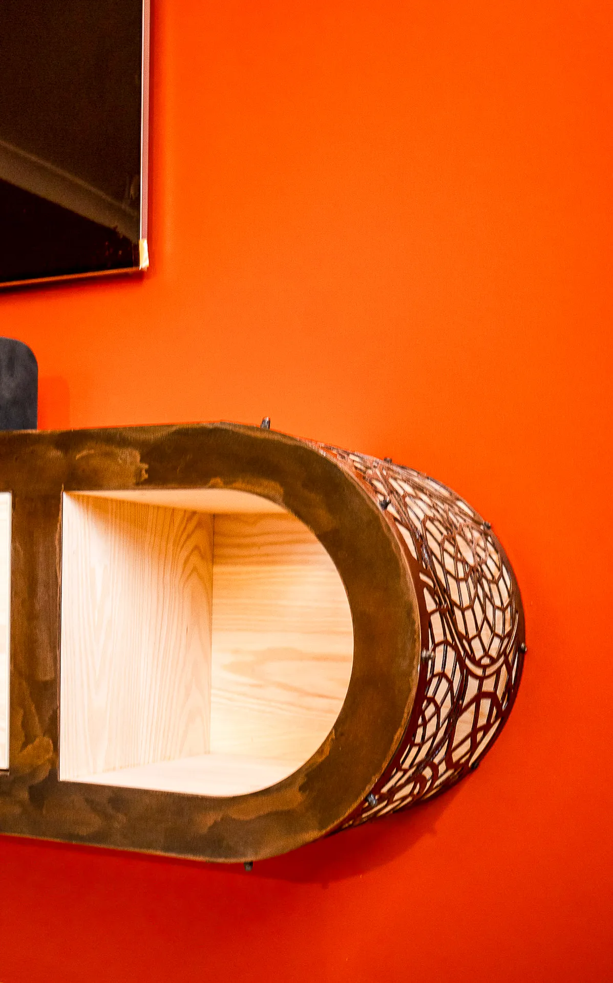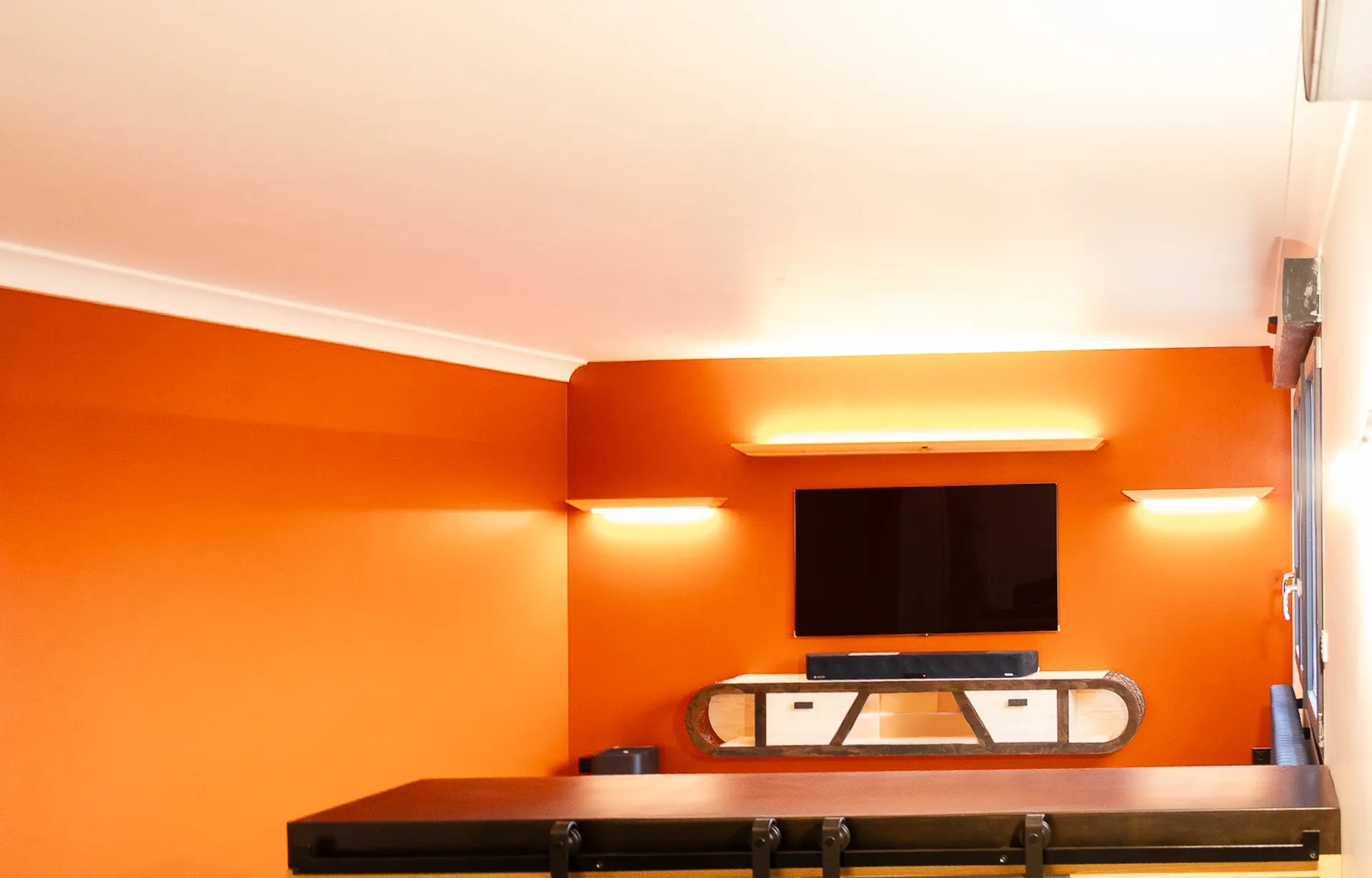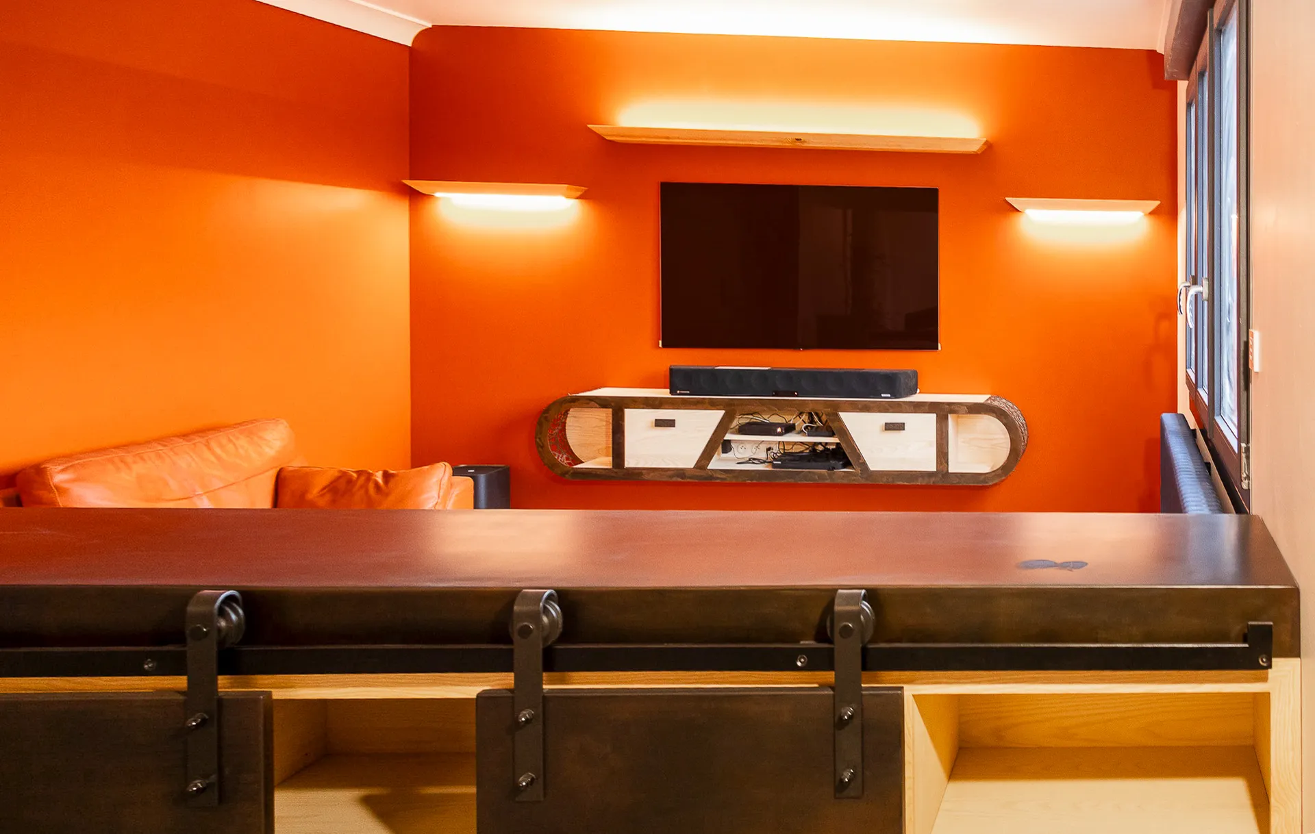 Les passages de câbles ont été intégrés dès la conception afin de garantir un rendu visuel épuré. Une ventilation adaptée pour permettre de préserver les appareils électroniques. Les étagères murales avec éclairage LED indirectement en valeur le mur et renforcent l’ambiance chaleureuse de la pièce.